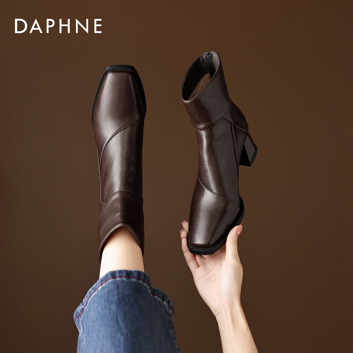 达芙妮棕色小短靴女2025冬季加绒新款粗跟马丁靴方头妈妈瘦瘦靴子