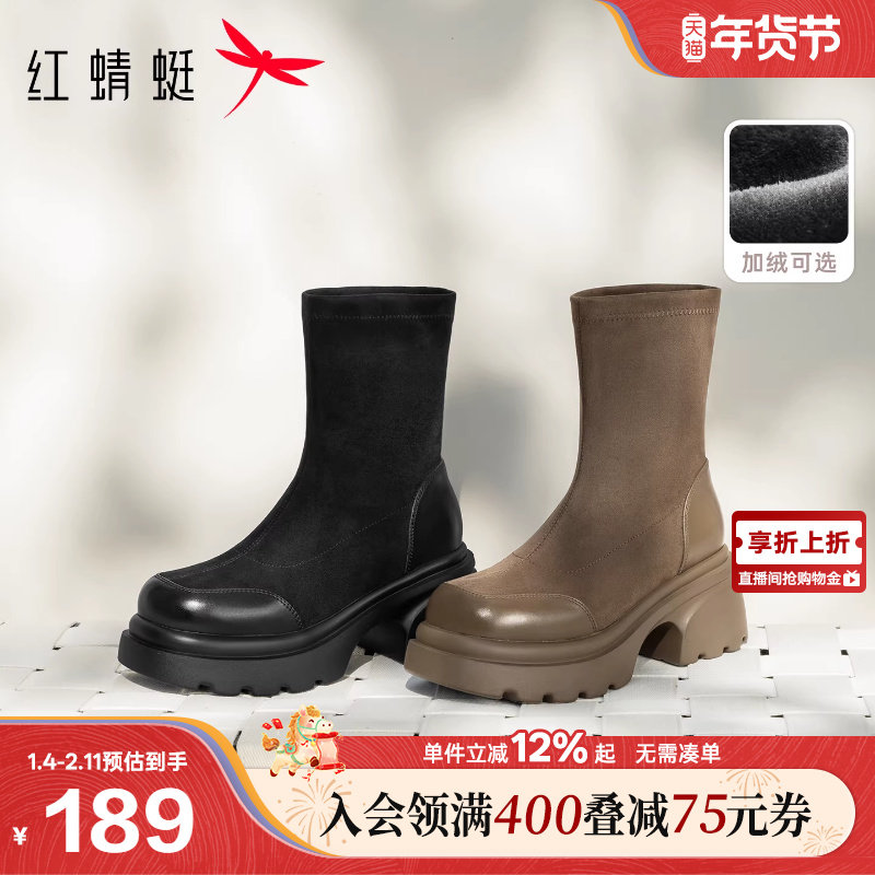 红蜻蜓厚底瘦瘦靴短靴女冬季新款女靴粗跟女鞋靴子加绒棕色弹力靴
