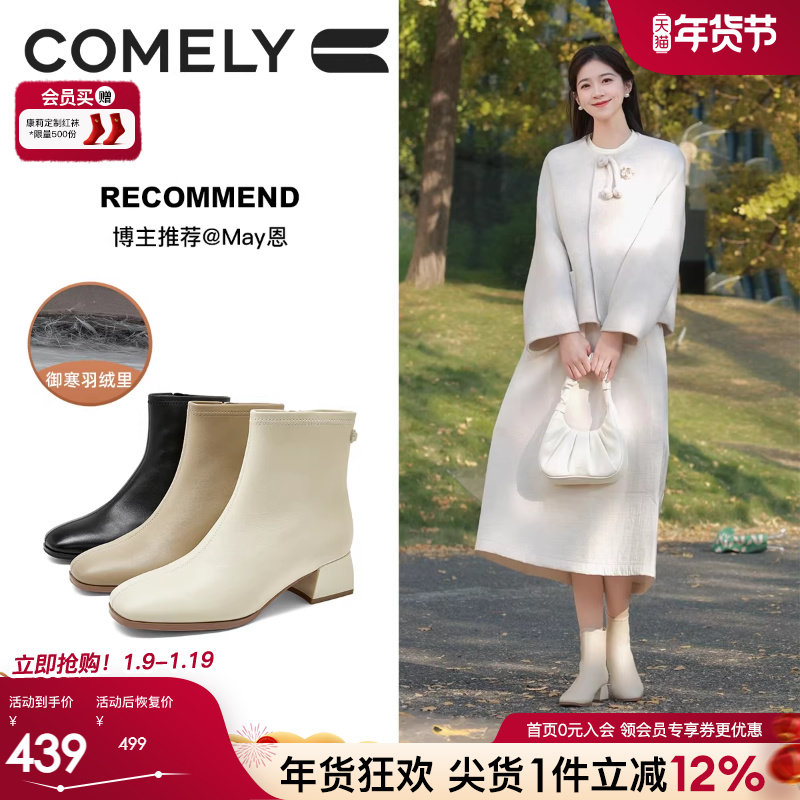 [明星同款]康莉羊皮粗跟短靴女25冬新款时尚百搭洋气黑色靴子加绒