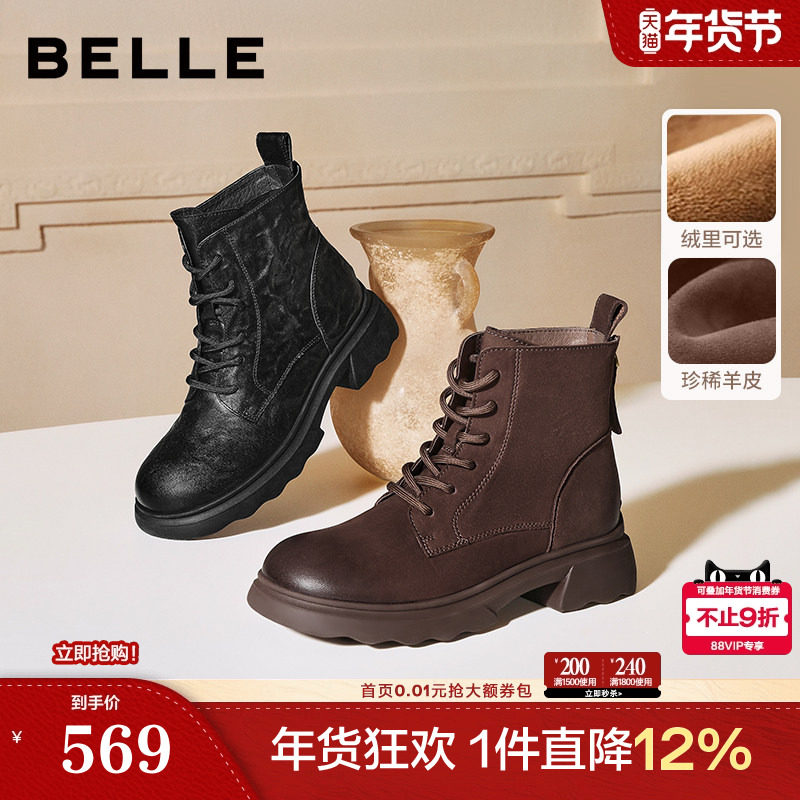 百丽英伦风羊皮马丁靴子女冬季加绒新款粗跟增高短靴子3NW45DD5