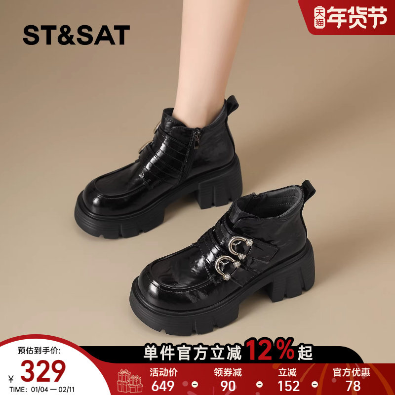 星期六粗跟乐福鞋女2025冬季新款英伦风加绒保暖小皮鞋增高短靴子