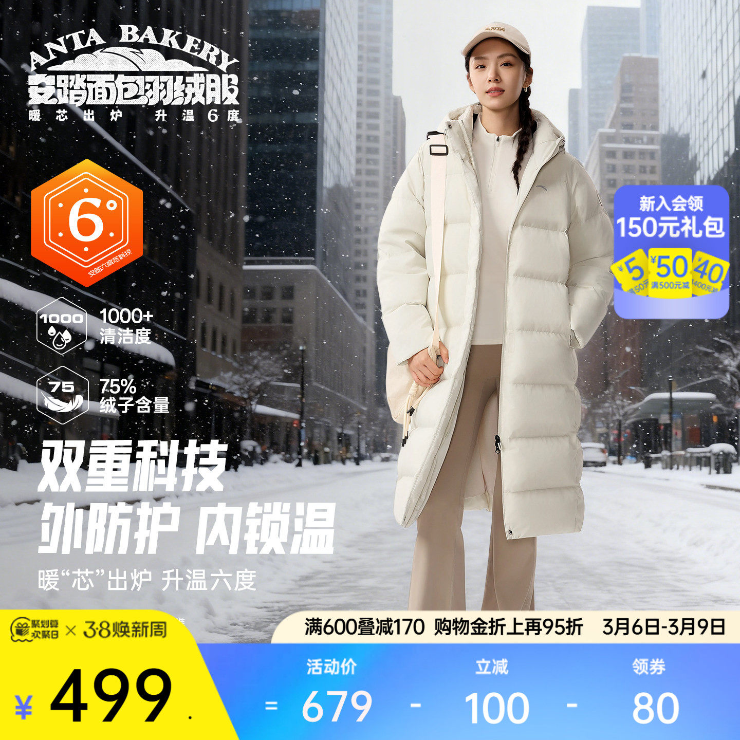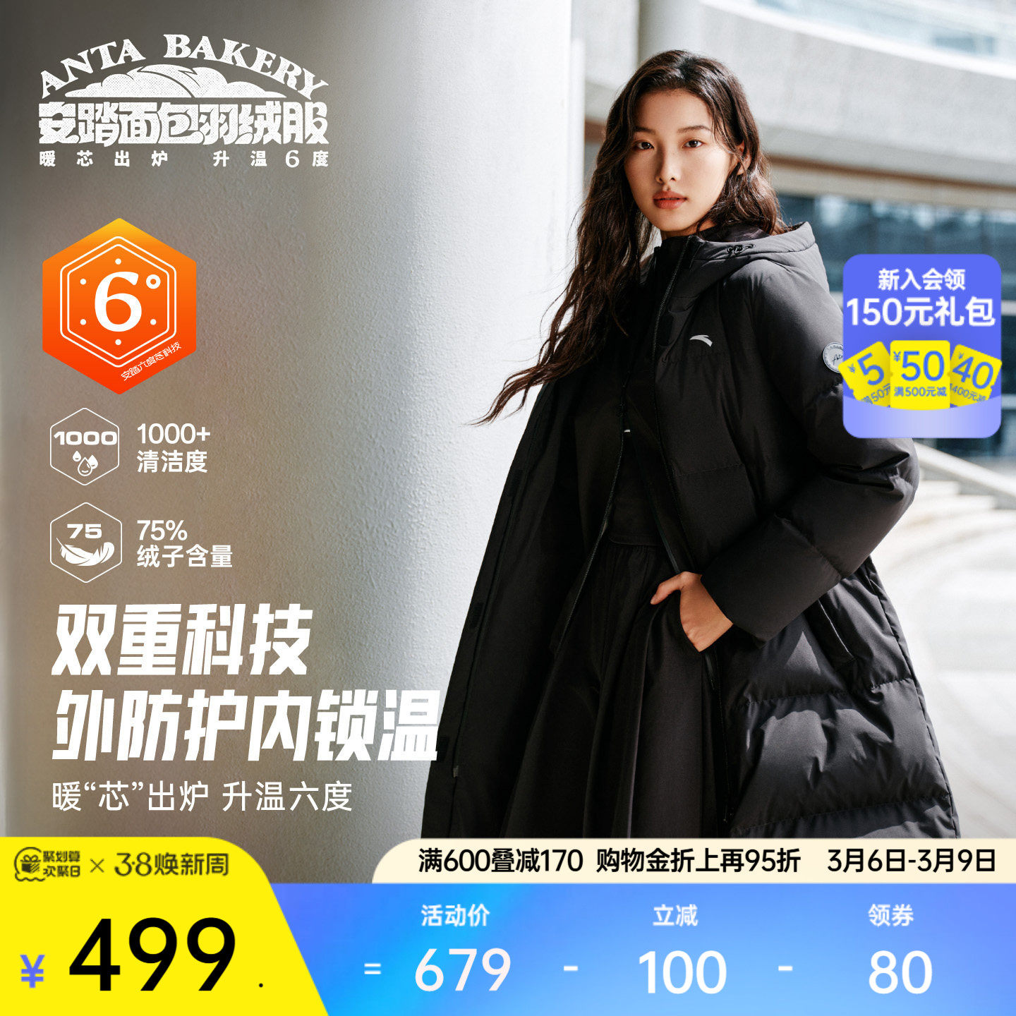 安踏六度芯鹅绒羽绒服四防女士2026新款正品长款连帽外套保暖上衣