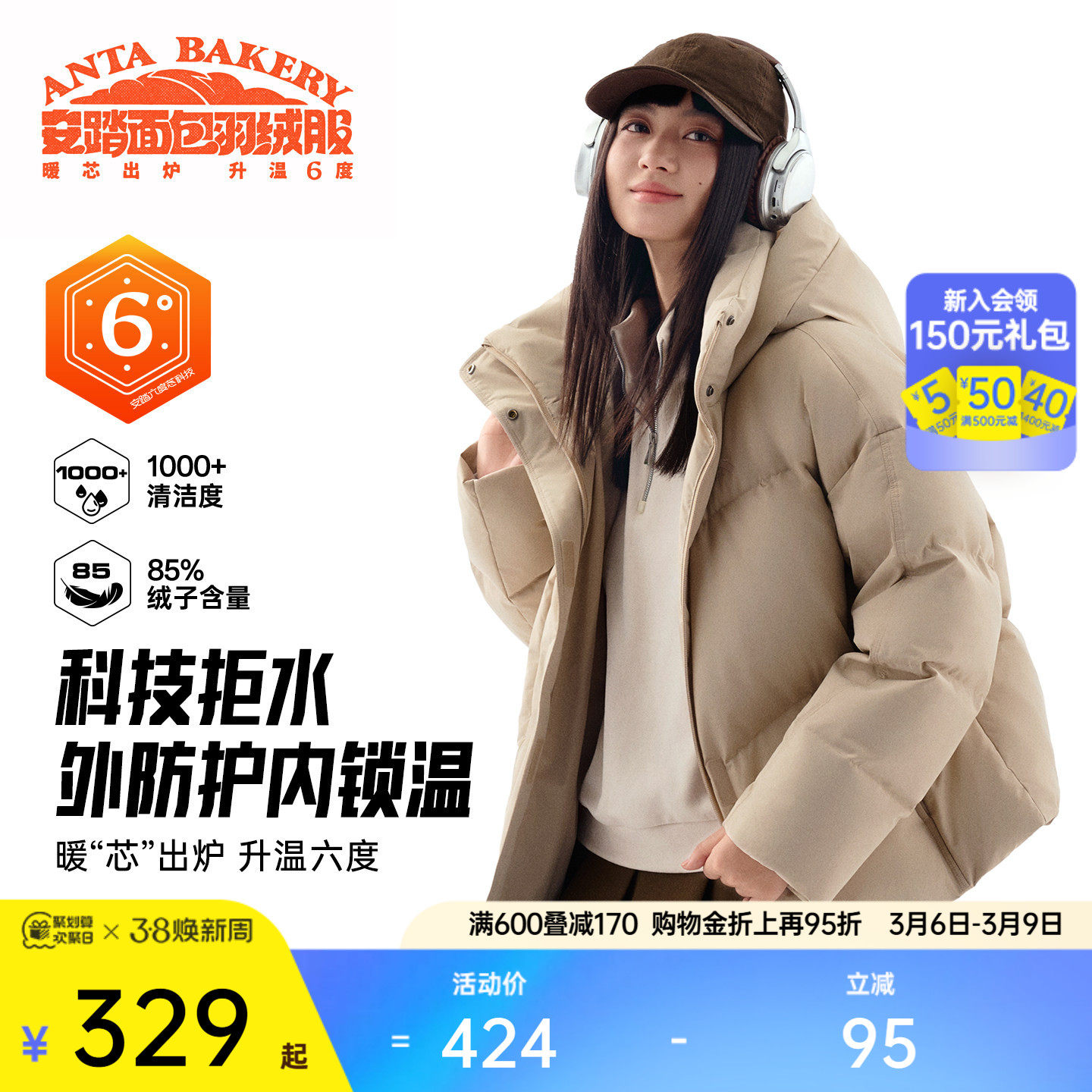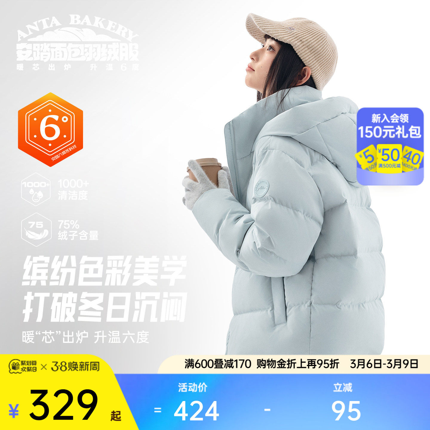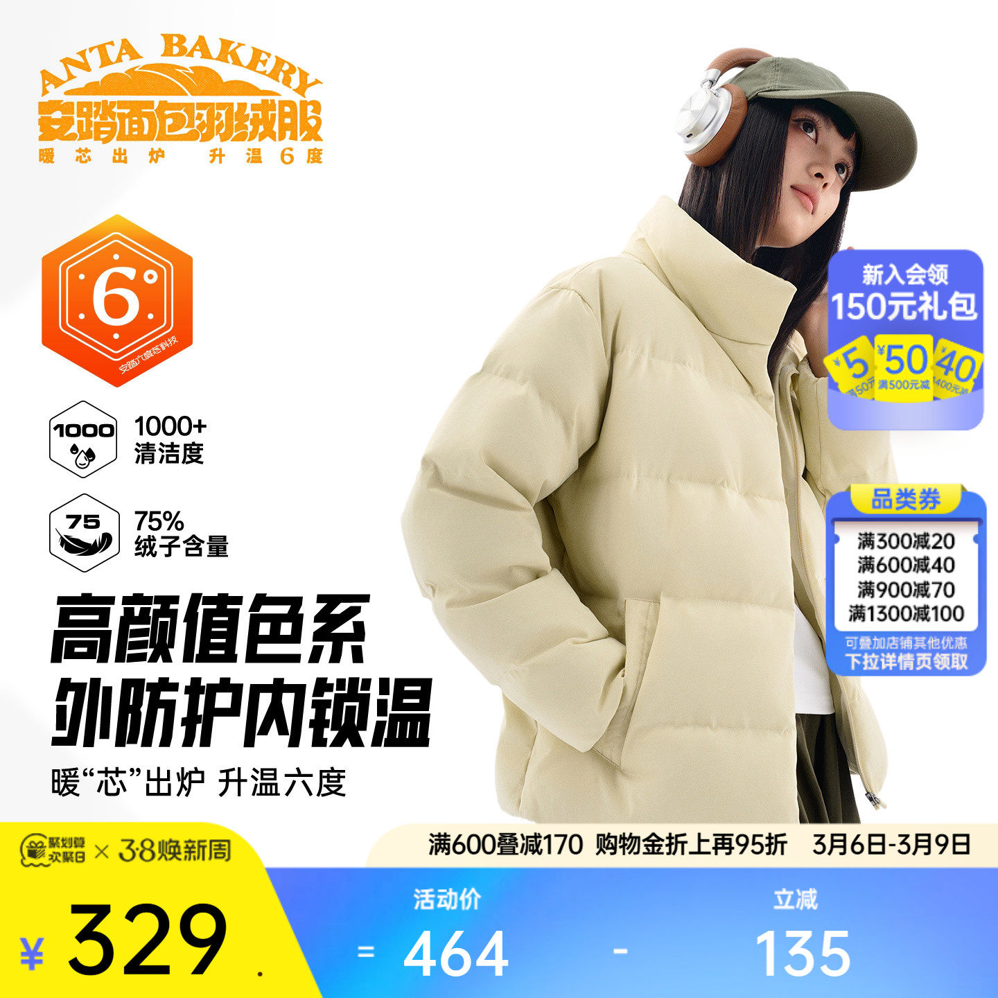 安踏面包羽绒服丨六度芯鹅绒服户外防风外套女士冬季加厚保暖夹克