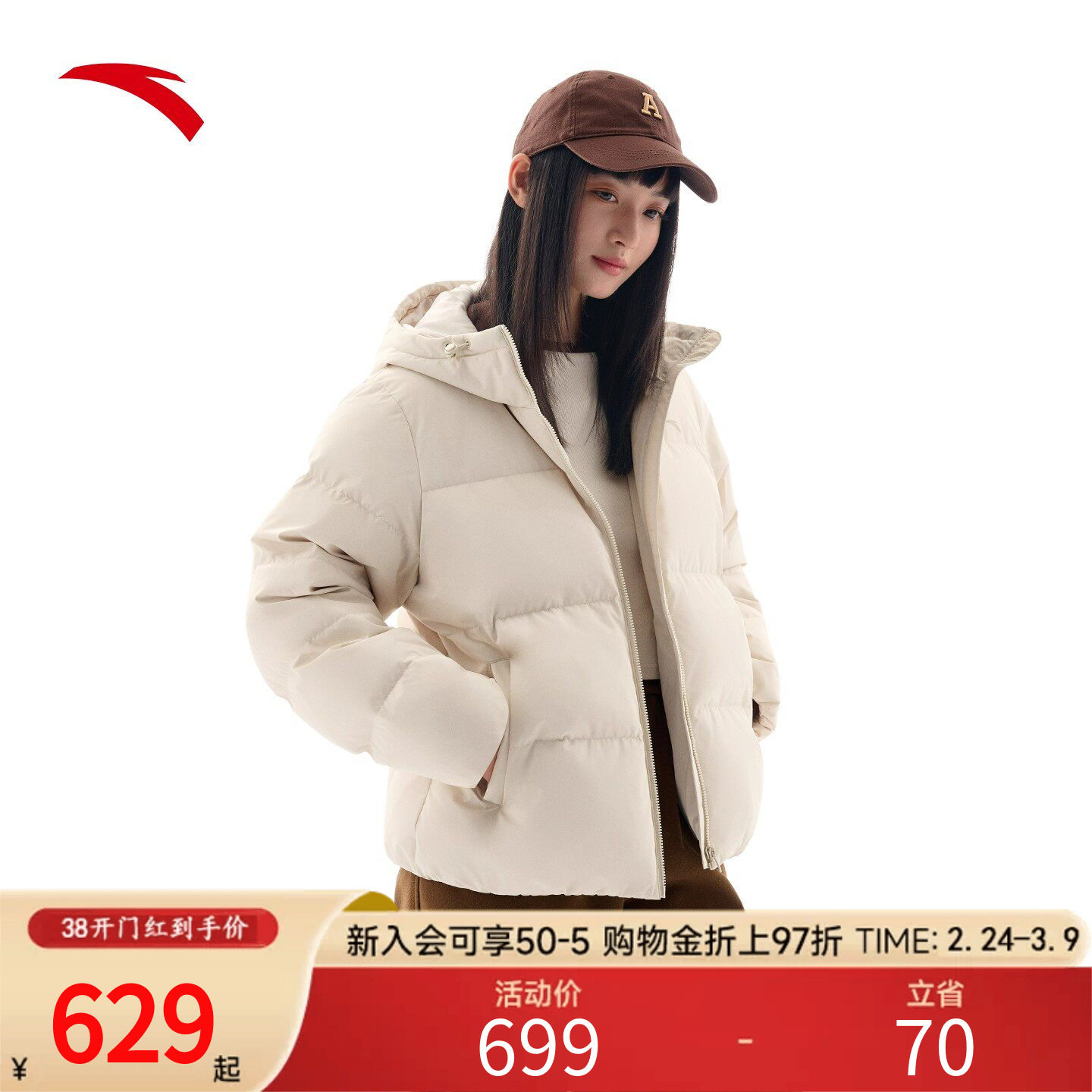 安踏短款羽绒服女士2026新款春季保暖防风连帽休闲面包服外套棉服