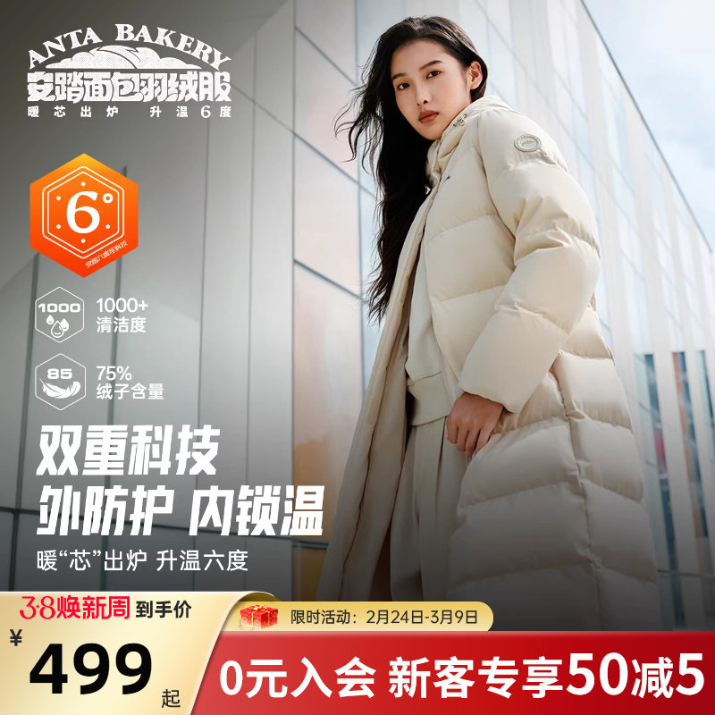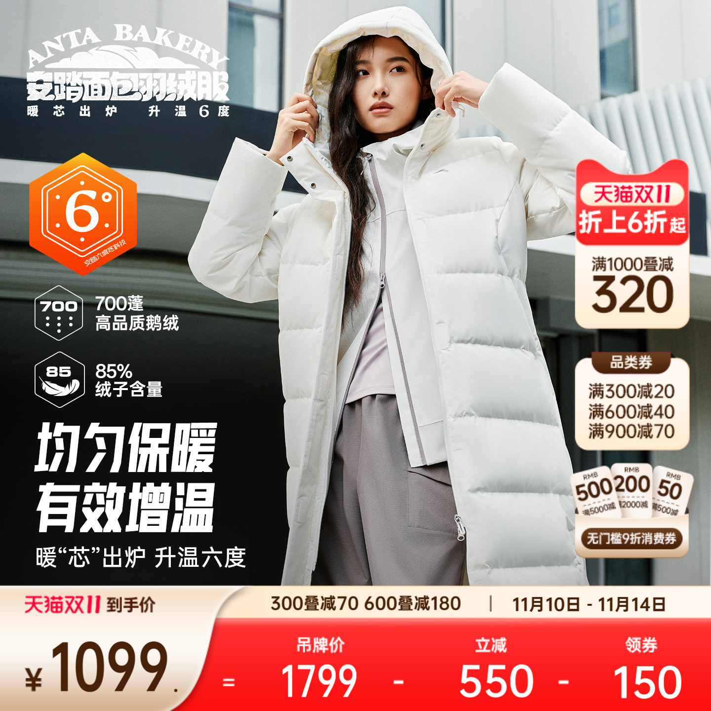 安踏面包羽绒服丨四防大白鹅绒外套女士冬季通勤防风保暖长款棉服