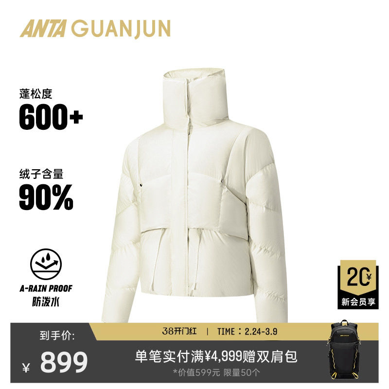 安踏冠军全天候短款高领90鸭绒羽绒服女士防泼水外套162540912