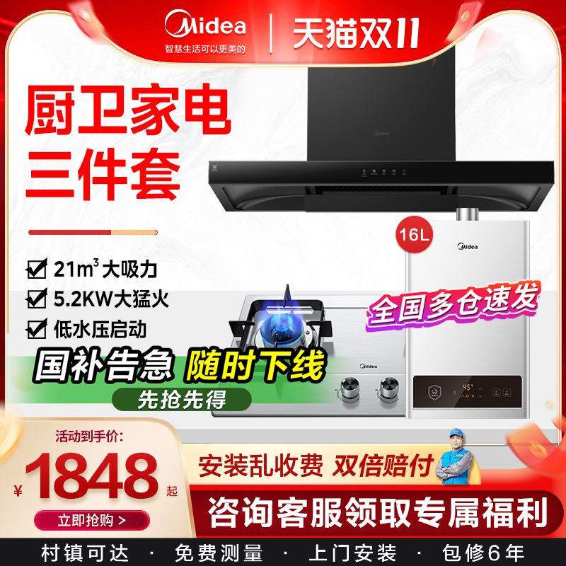 美的抽油烟机燃气灶套餐侧吸式智能家用热水器消毒柜厨房三件套装