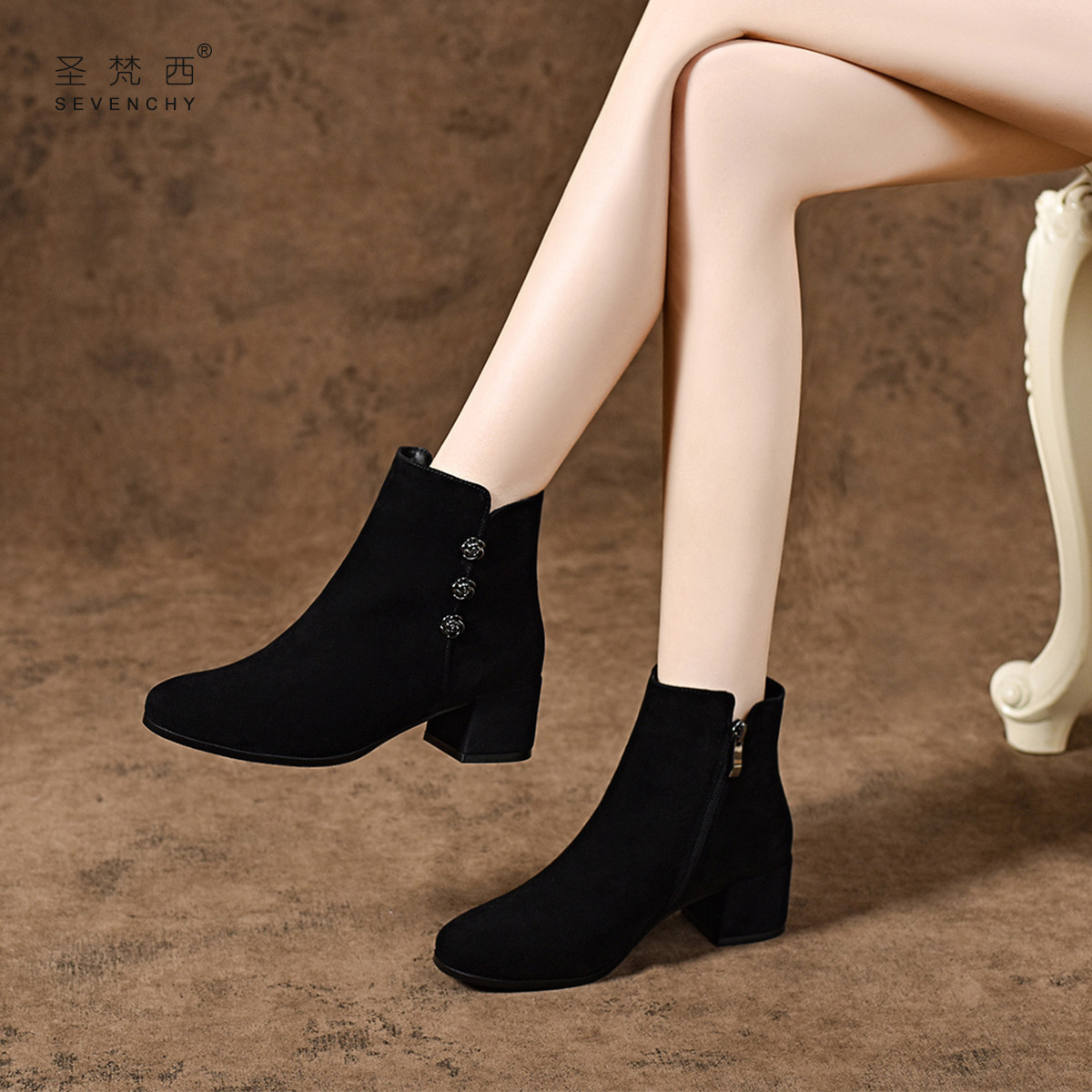 2025新款秋冬季女鞋高跟鞋绒面粗跟短靴时尚磨砂羊皮靴子真皮女靴