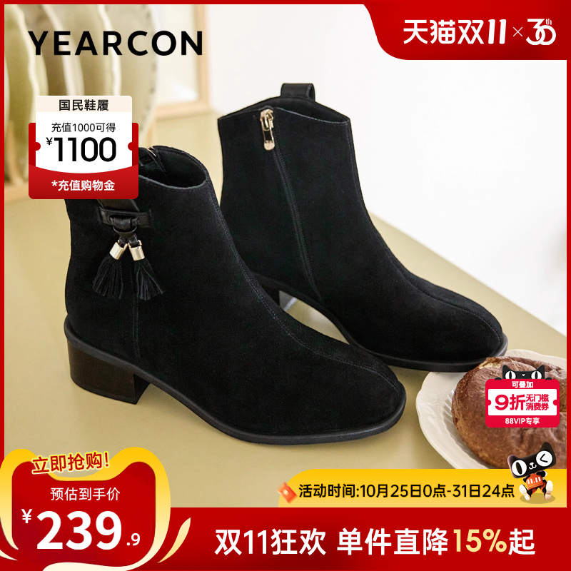 意尔康女鞋2025冬季休闲短靴粗跟气质显瘦复古及踝靴女士磨砂单靴
