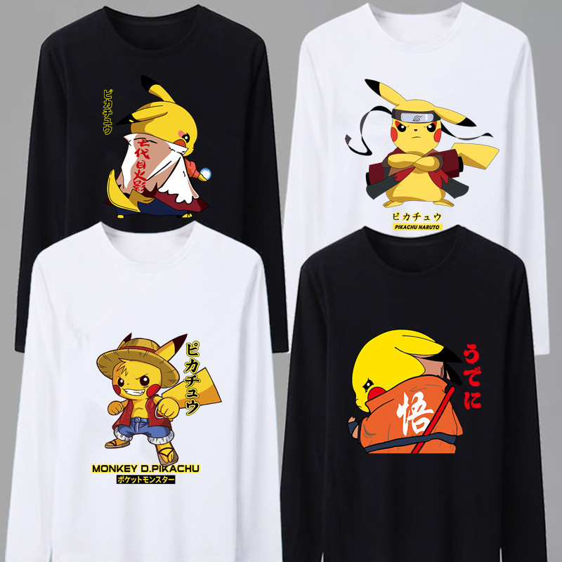 皮卡丘联名鸣人佐助T恤秋季长袖上衣纯色潮流情侣装火影忍者衣服