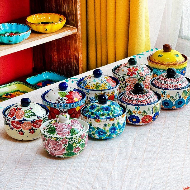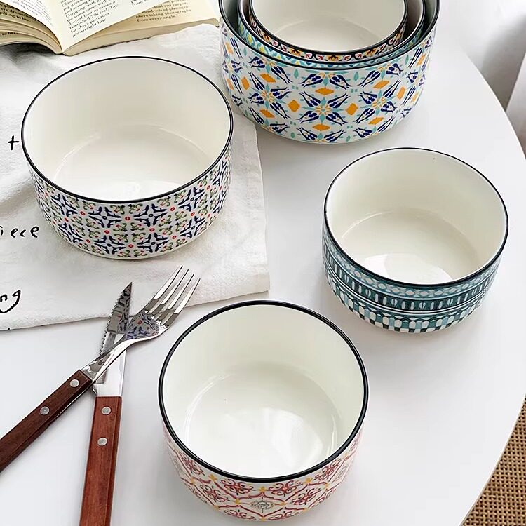 安木良品 外贸原单 法式ins风艺术彩色图腾釉下彩陶瓷早餐汤饭碗