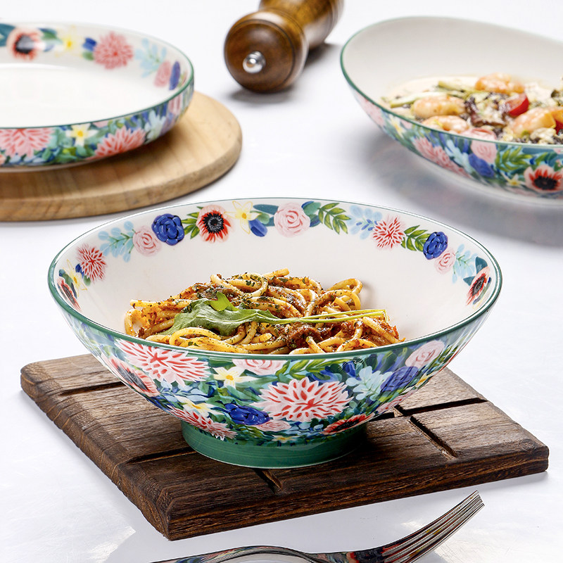 轻奢复古繁花艺术陶瓷碗家用高颜值8英寸嗦粉沙拉碗 ins 风餐具