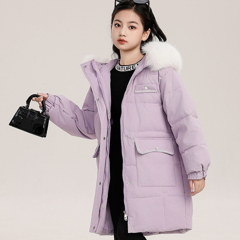 女童紫色连帽毛领羽绒服中长款2025新款洋气小学生中大童棉袄外套