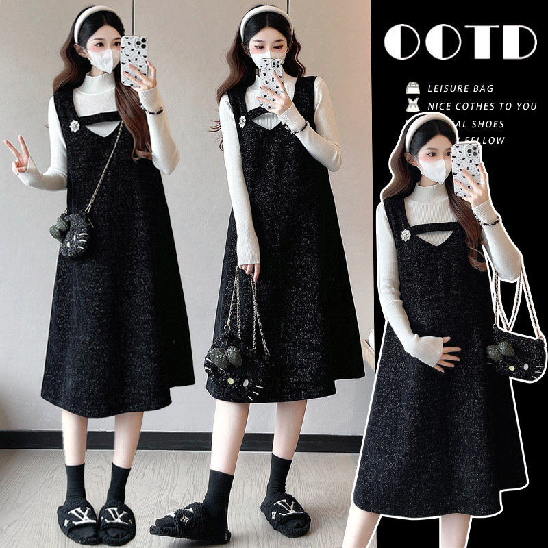 吴童童加绒加厚黑色波点背带裙女秋冬新款韩系气质宽松长款连衣裙