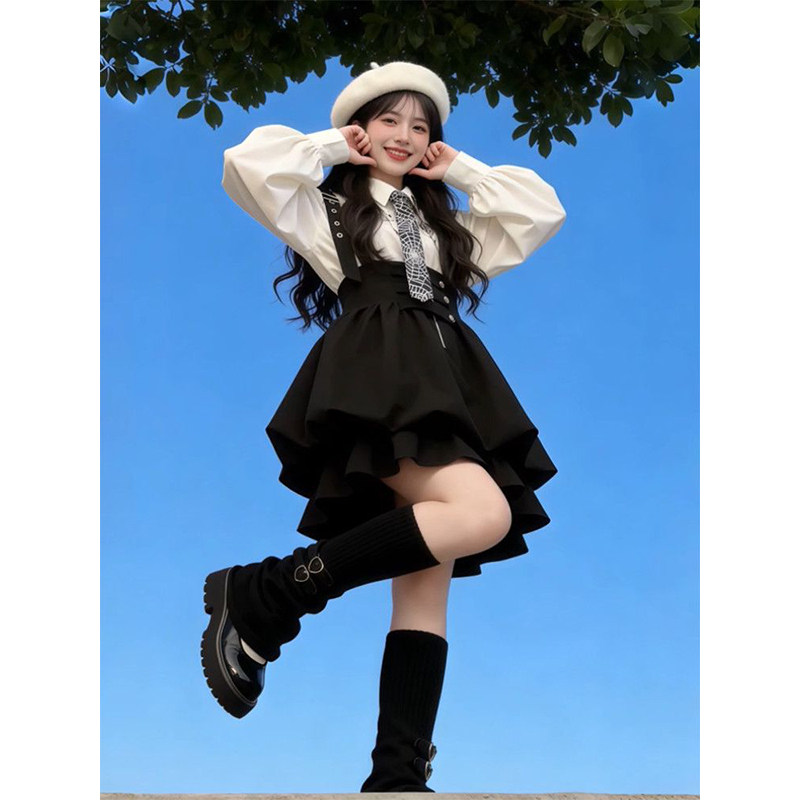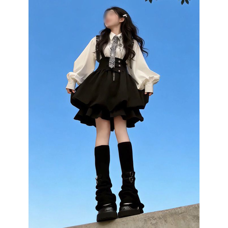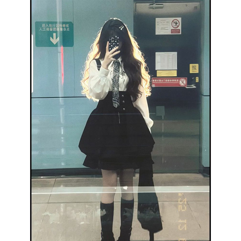 小众时尚甜妹可爱风女学生穿搭一整套黑色背带裙叠穿白色印花衬衫