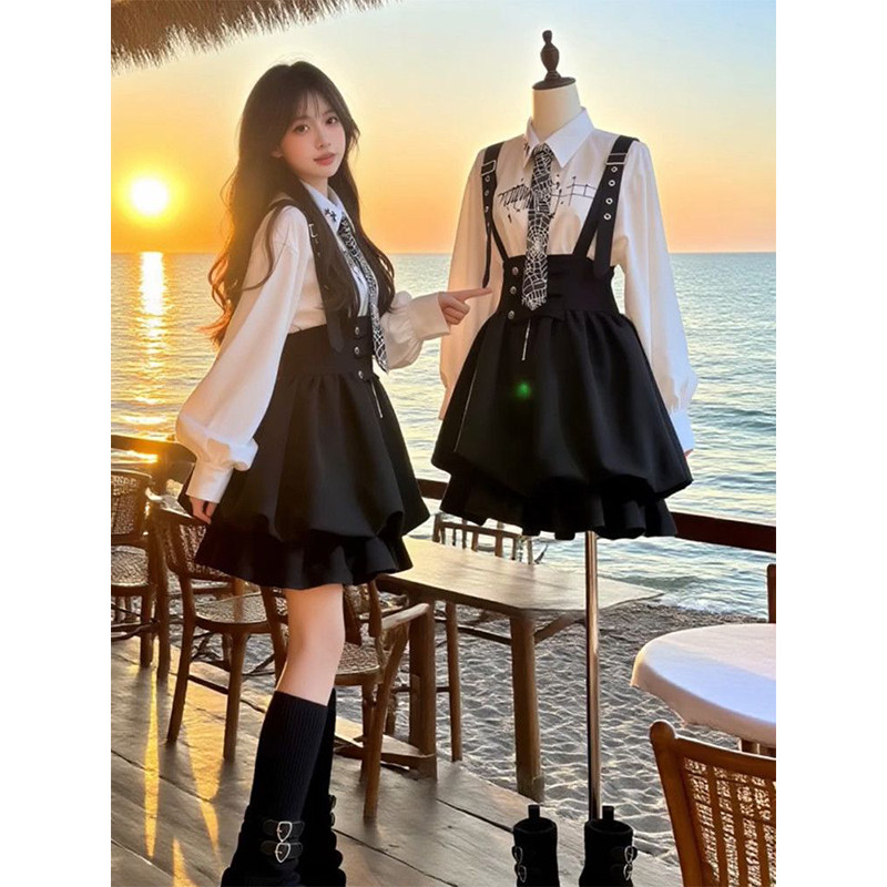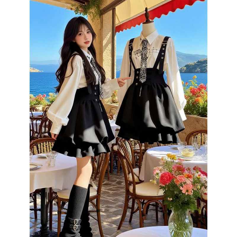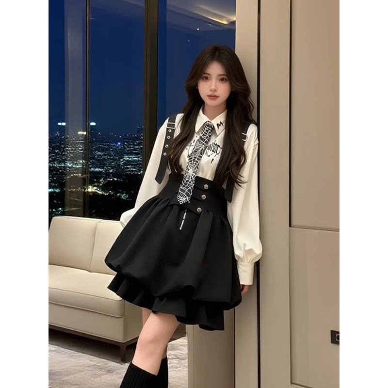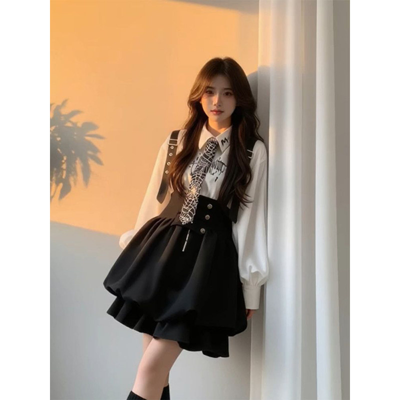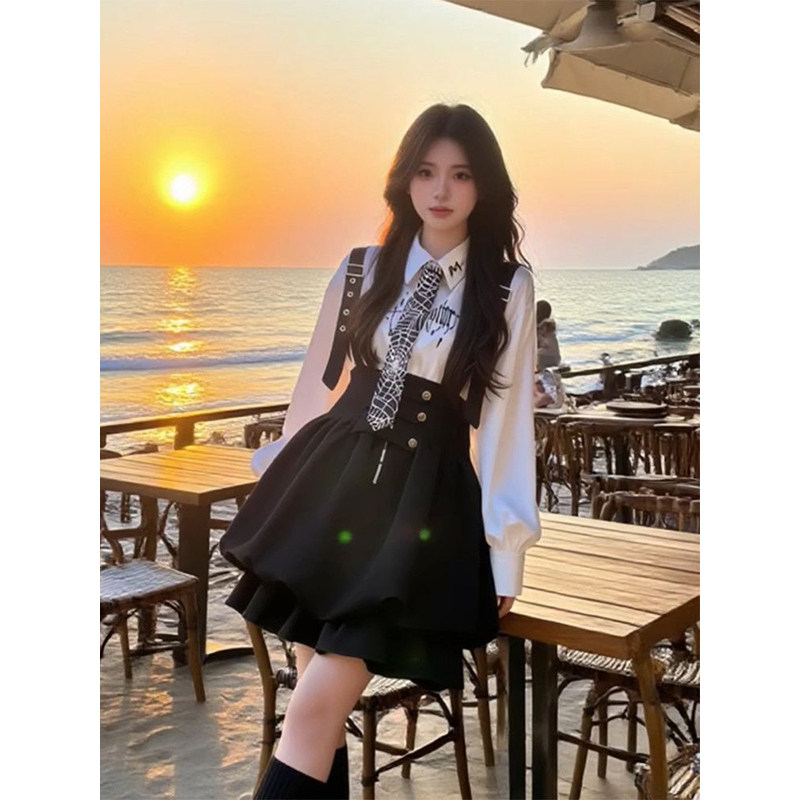 韩系时尚高级感黑色背带裙女学生搭配印花白色长袖衬衫新款两件套