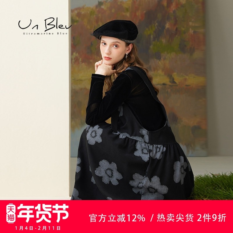 UnBleu黑色背带裙春秋季新款宽松背心连衣裙女装印花美拉德裙子