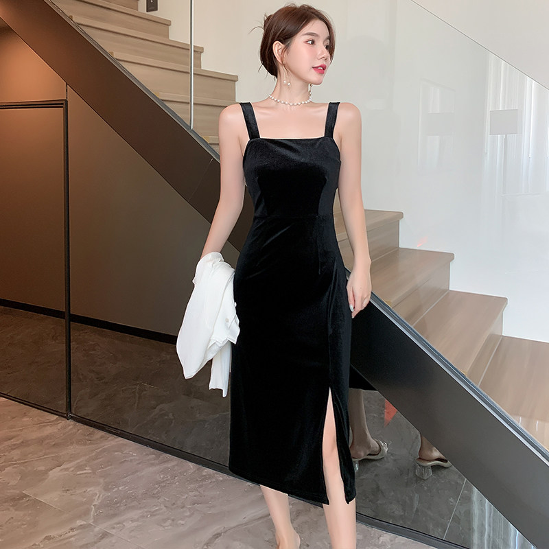 速发2025春季新款金丝绒吊带连衣裙内搭打底黑色背带裙裙叉中长开