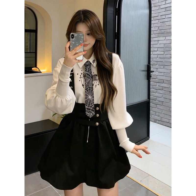 韩系甜妹少女可爱风白色印花衬衫搭配黑色背带裙秋冬新款两件套装