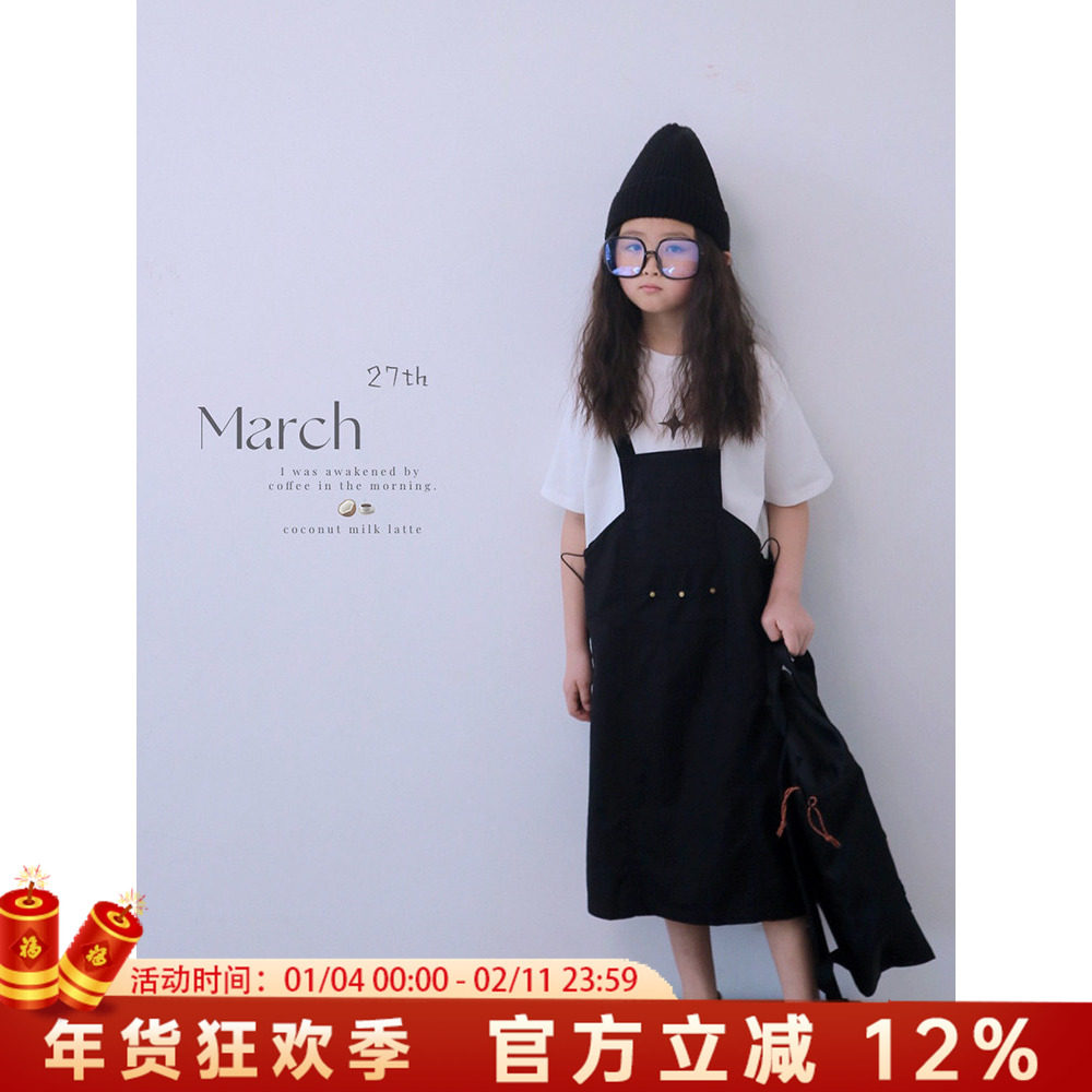 女童夏季连衣裙2025新款大童洋气时髦短袖初中生高级风黑色背带裙