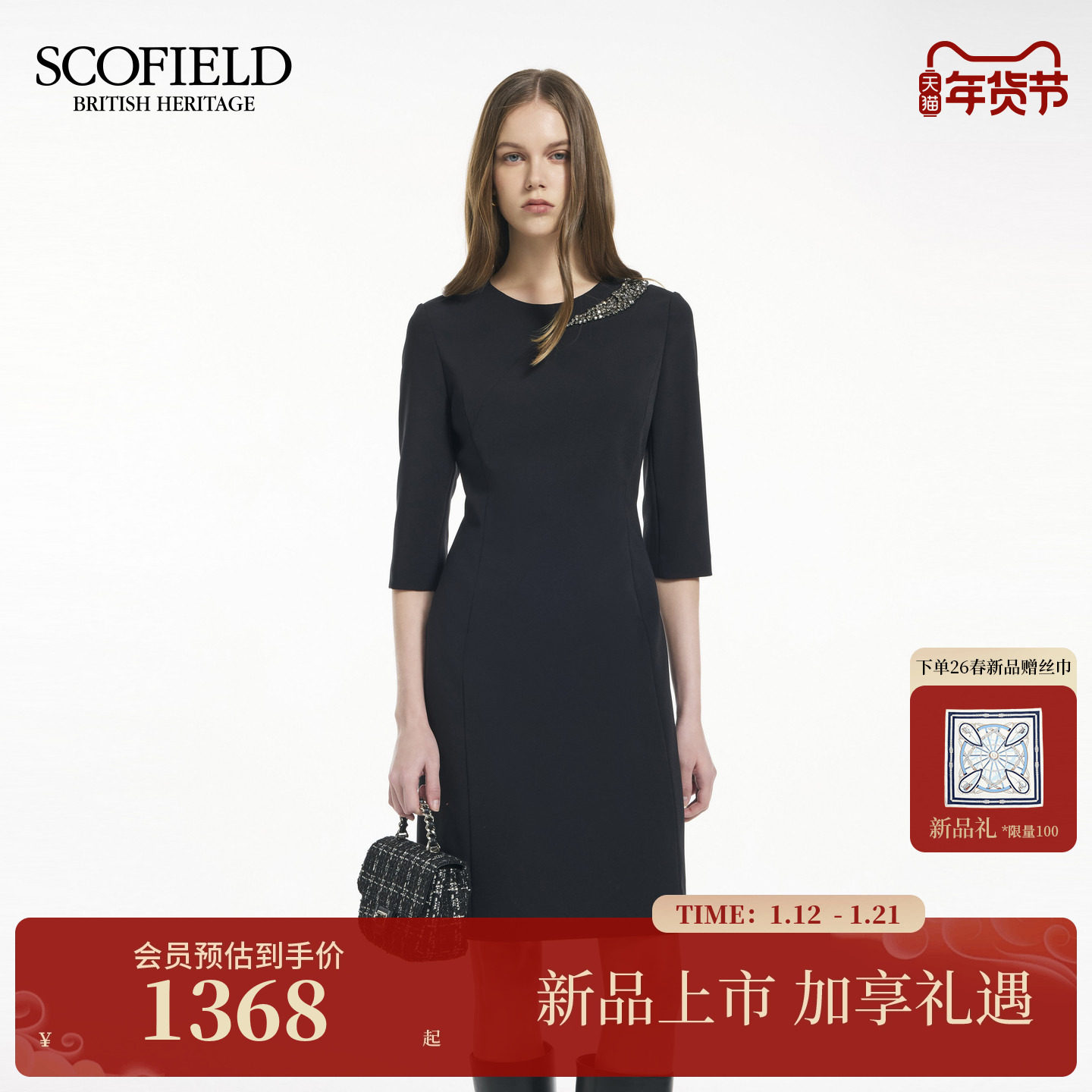Scofield女装靓丽吸睛微收腰七分袖连衣裙不对称钻珠2026春季新品