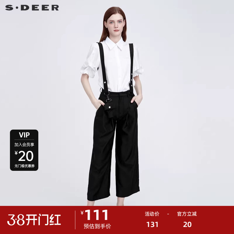 sdeer圣迪奥女装秋时尚压褶黑色背带阔腿长裤S22180814