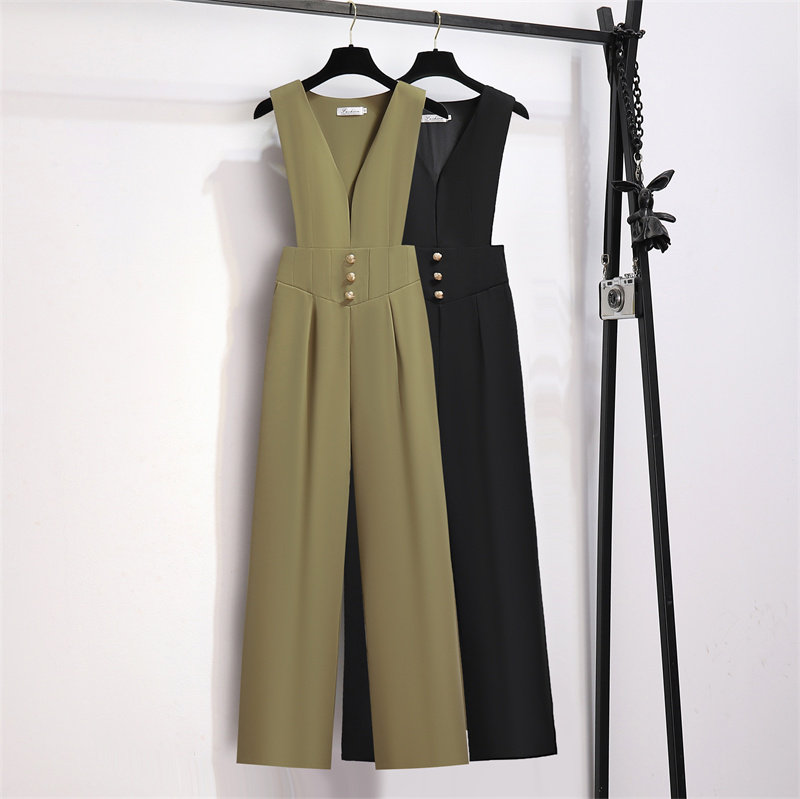 时尚黑色西装背带裤女西装夏季新款百搭收腰显瘦高腰阔腿连体长裤