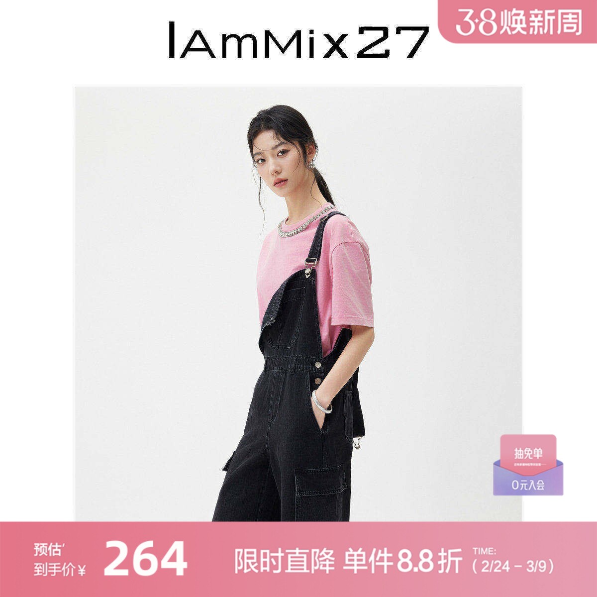 IAmMIX27春秋黑色牛仔背带裤女宽松显瘦全棉工装风连体裤女直筒裤