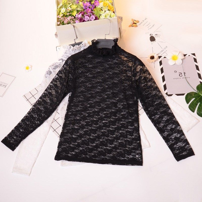 蕾丝高领打底衫女长袖百搭修身显瘦小衫性感加绒加厚网纱内搭上衣