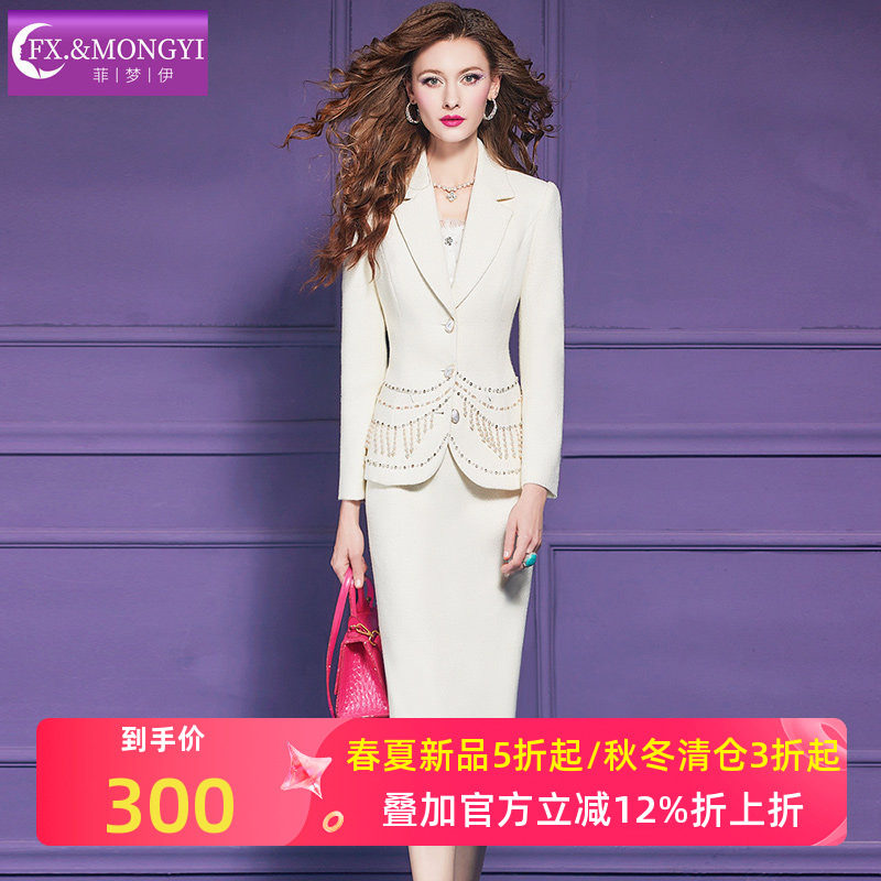 菲梦伊含羊毛钉珠白色毛呢套装女冬季商务正装西装外套职业半身裙