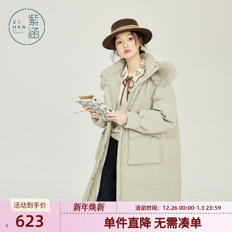紫涵毛领连帽防风中长款白鸭绒羽绒服女冬季新款森系宽松加厚外套