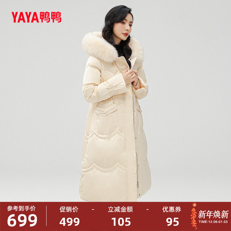 鸭鸭羽绒服女2025冬季新品中长款过膝狐狸毛领保暖加厚宽松外套C