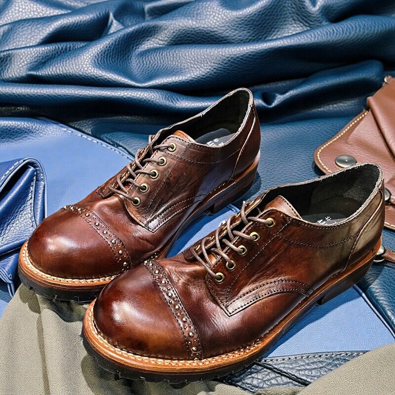 复古水洗马臀皮布洛克雕花商务休闲皮鞋男真皮底亮面固特异德比鞋