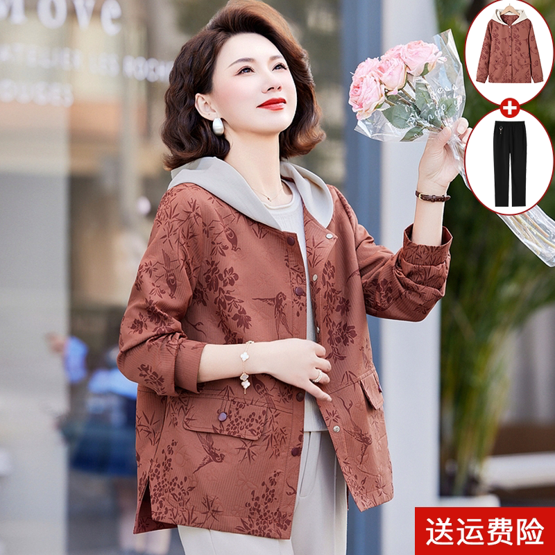 高档提花风衣秋季新款连帽设计大码遮肚显瘦中长款中年妈妈外套女