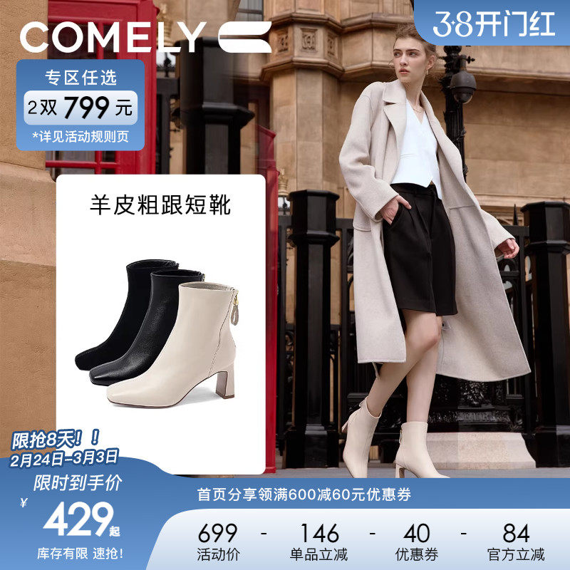 戈美其方头短靴粗跟高跟踝靴气质百搭时装靴瘦瘦靴侧拉链中筒女靴