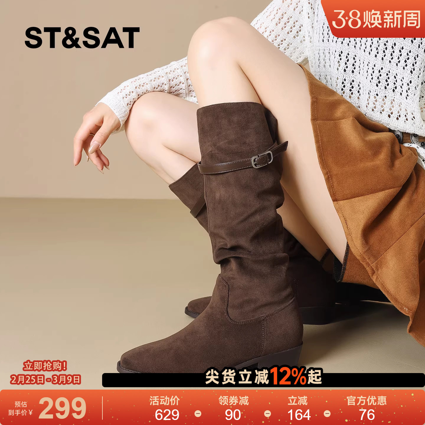 星期六堆堆靴女2025年新款冬季粗跟中筒靴西部牛仔靴高跟长筒靴直
