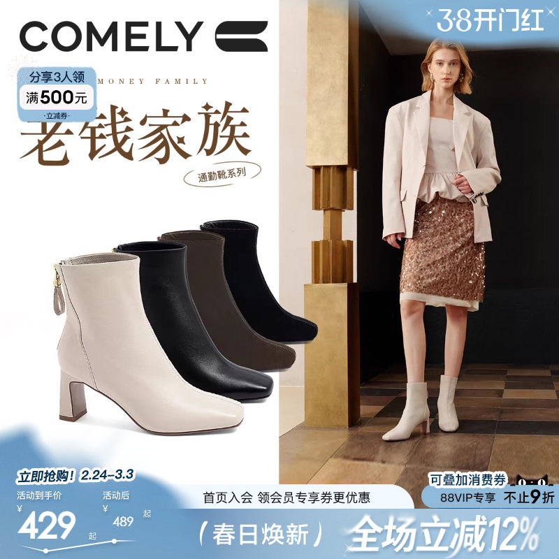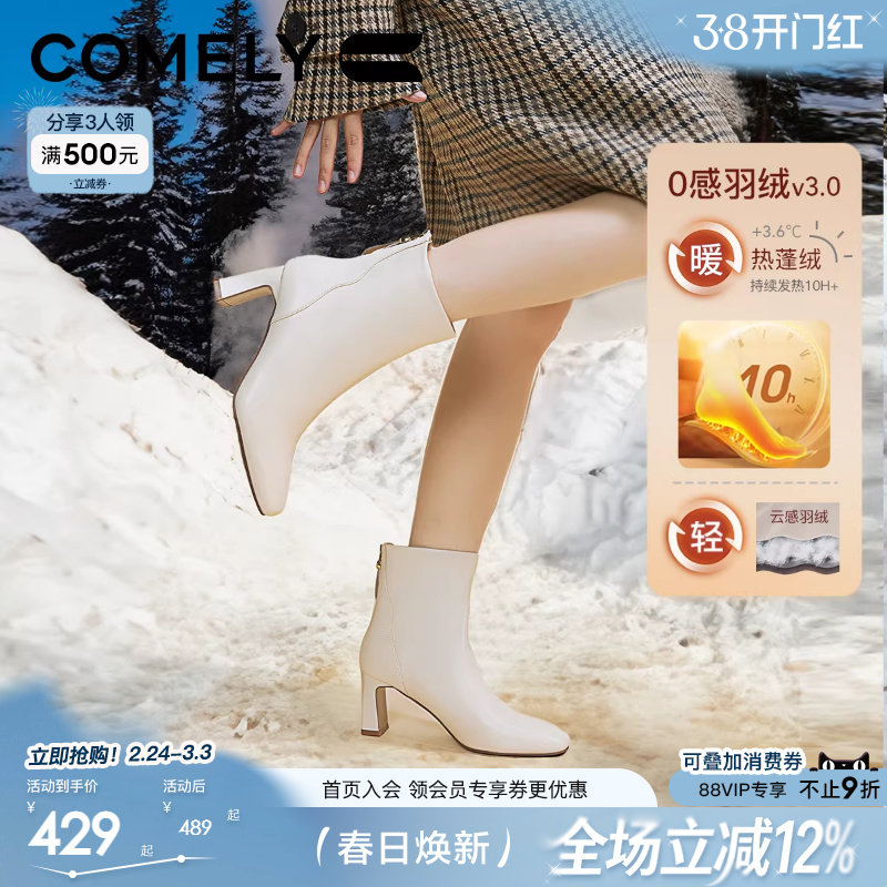 康莉商场新款真皮时装靴女2024年冬季时尚粗跟高跟短靴女款中筒靴