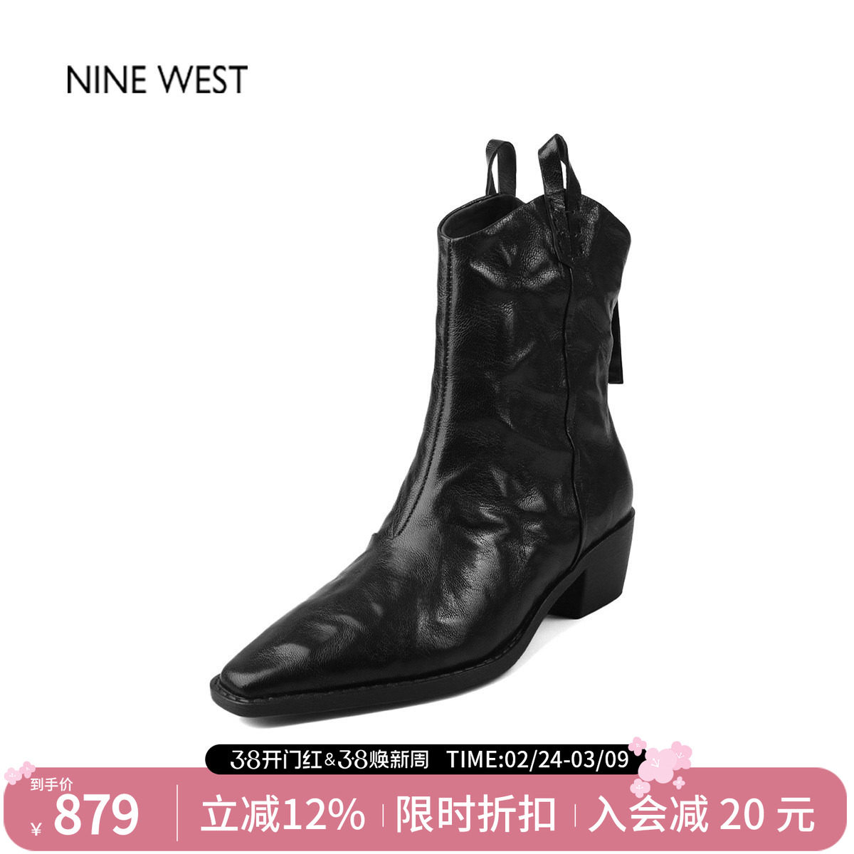 奥莱专供Nine West/玖熙法式粗跟中筒靴切尔西女靴高跟短靴靴子冬