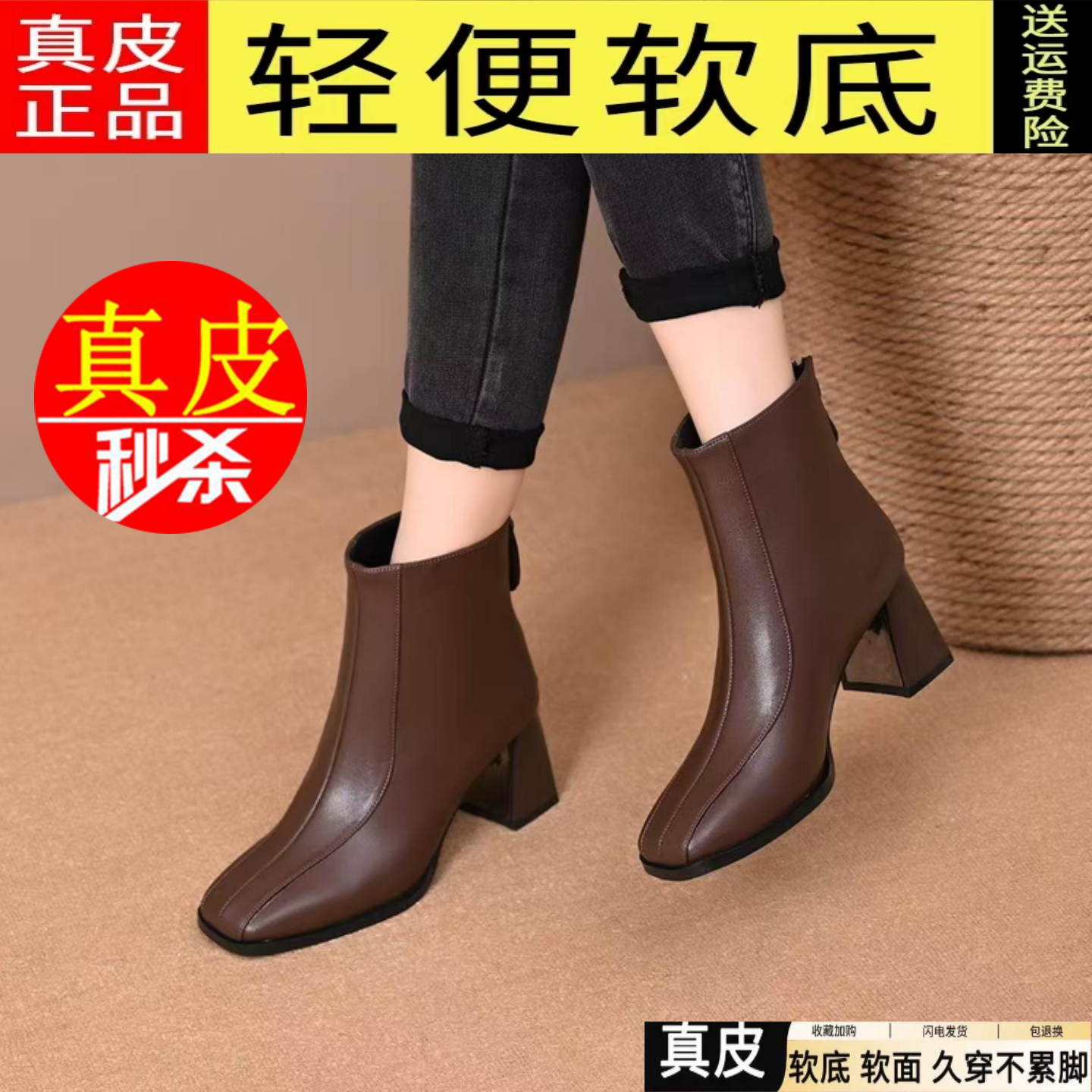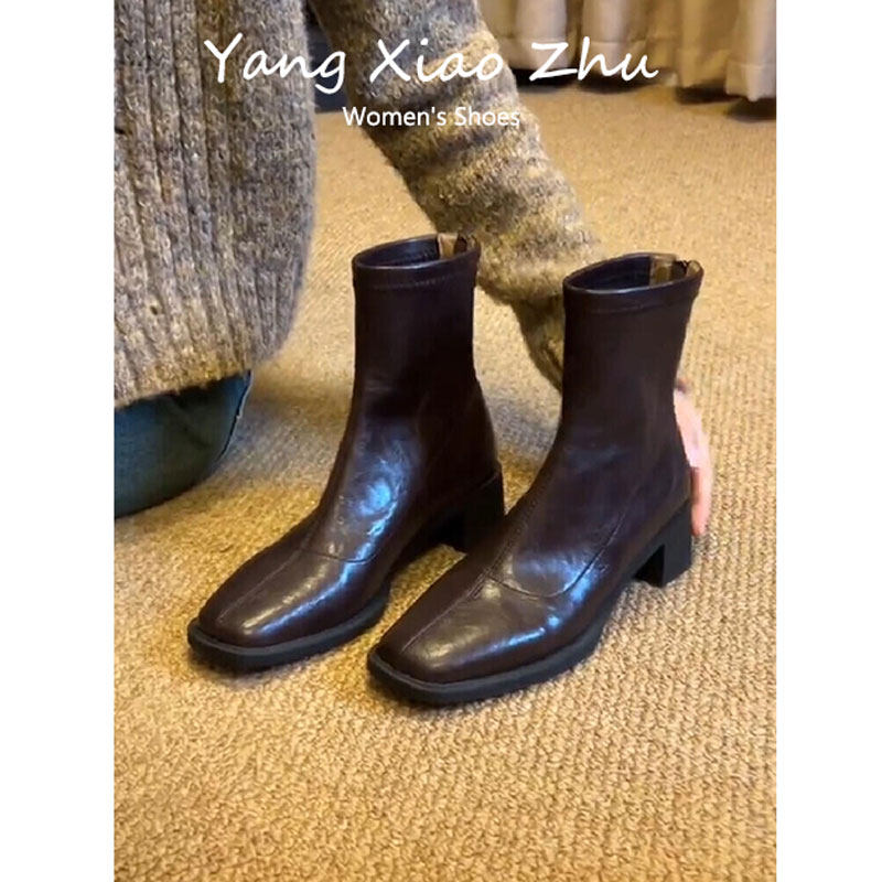 真皮~骄屿方头粗跟短靴2025新款秋冬瘦瘦靴子气质通勤高跟马丁靴