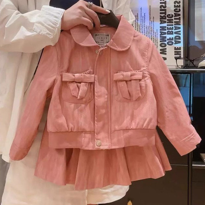 春秋小女孩儿童宝宝小香风蝴蝶结粉色皮衣夹克外套百褶半身裙套装