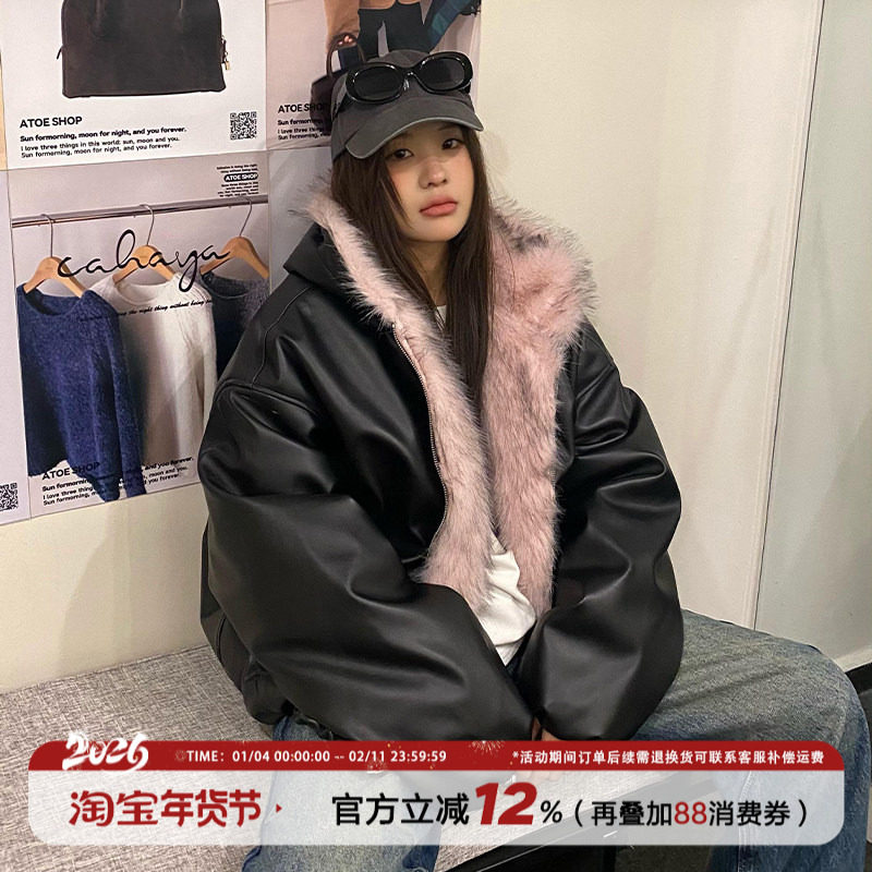 饭饭又饿了复古座山雕粉色毛绒皮衣外套女冬季小众设计感防风帽衫