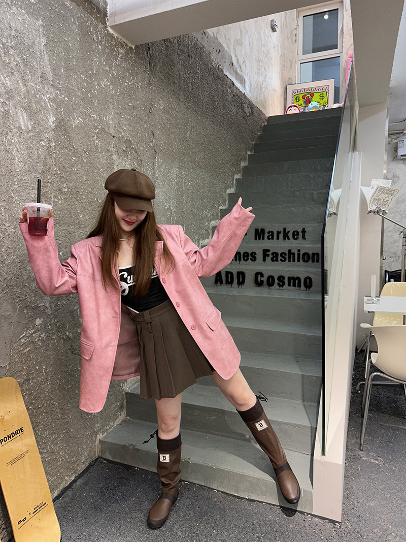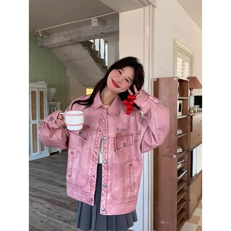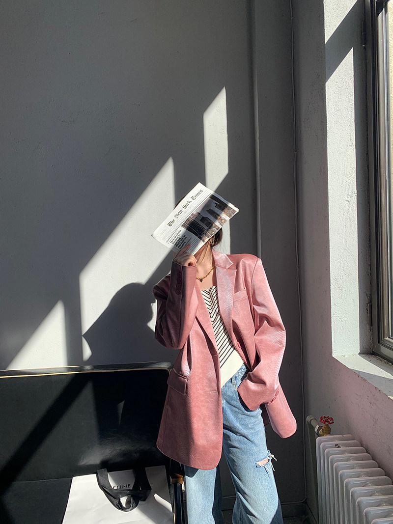 CIZZLEMORE【粉红玫瑰】韩版粉色皮衣西装外套高级感气质宽松上衣
