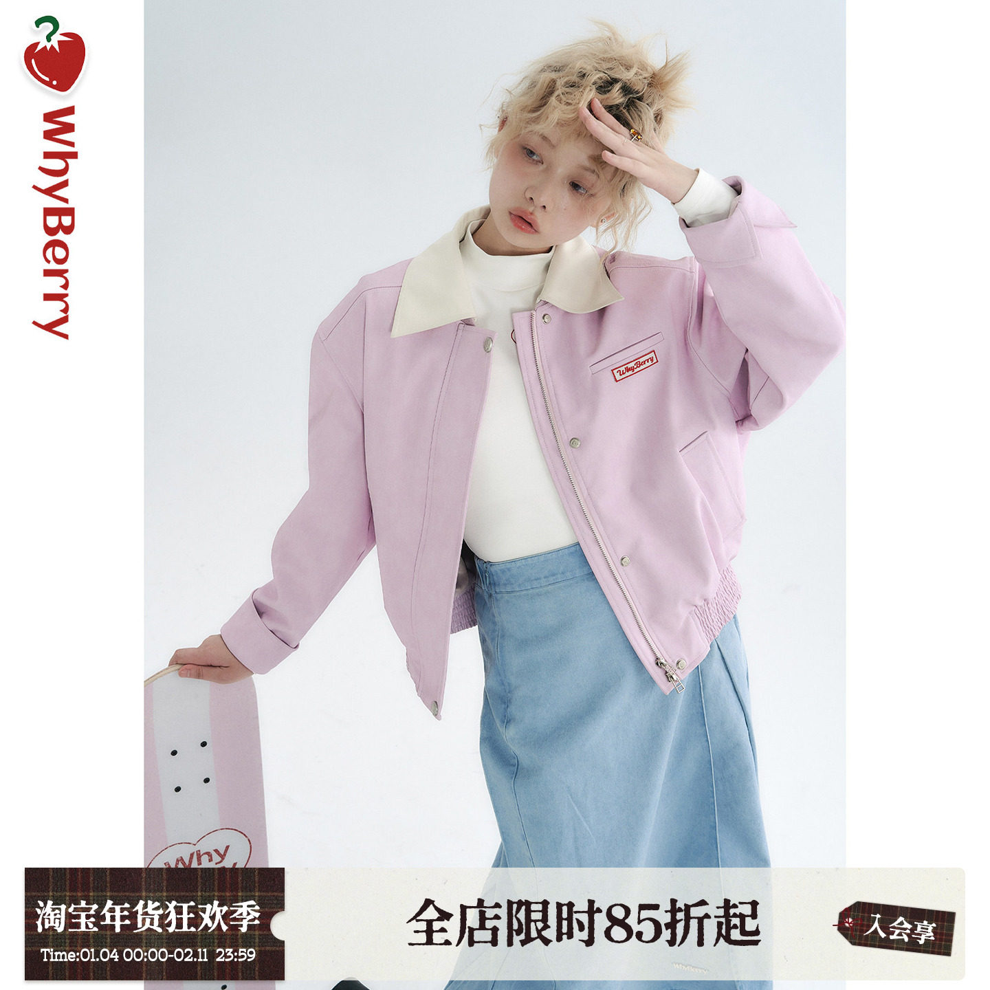 WhyBerry 22AW“拽妹皮衣”粉色垫肩皮衣美式短外套夹克套装