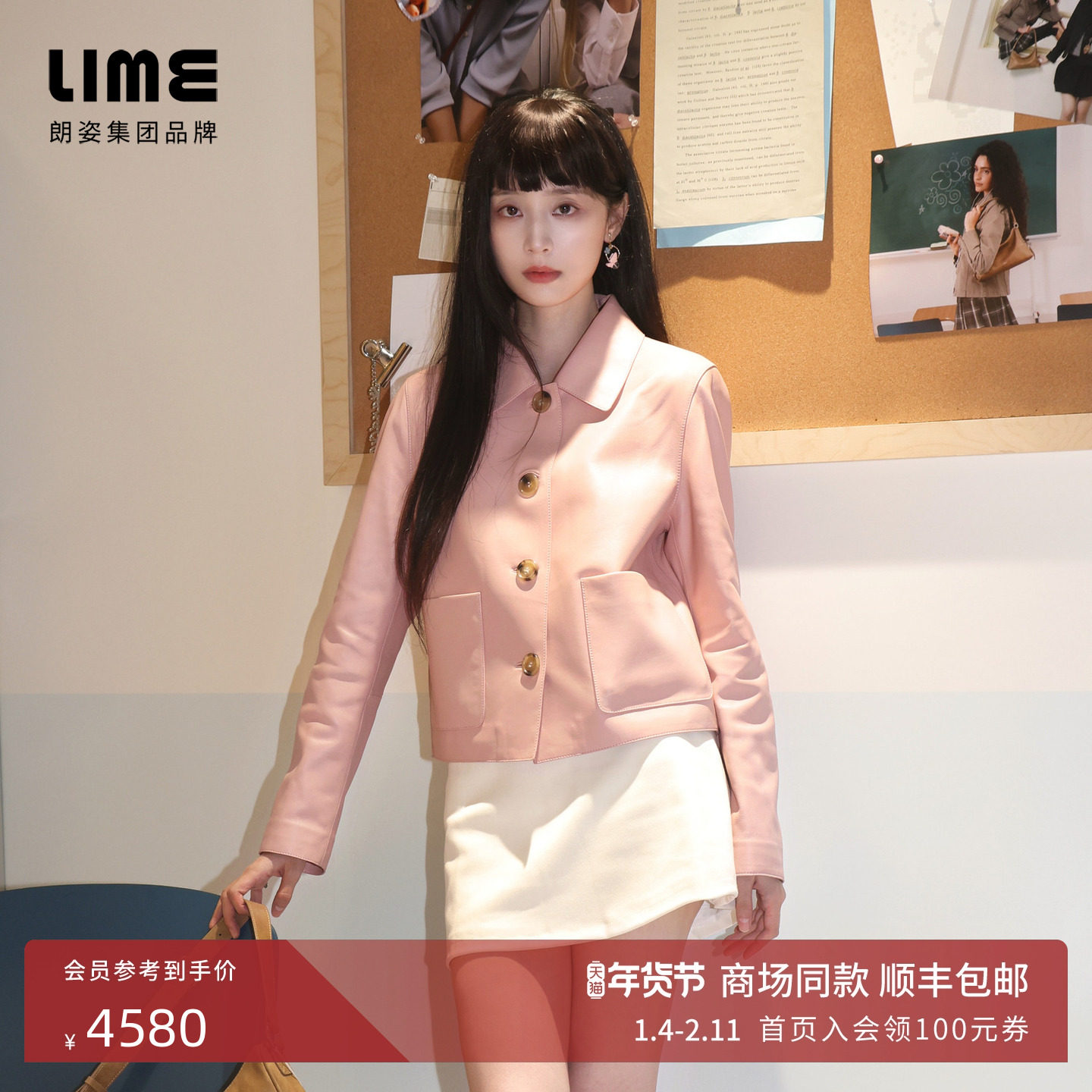 【龚婉怡同款】LIME莱茵粉色绵羊皮短截上衣灰粉色皮衣25秋外套