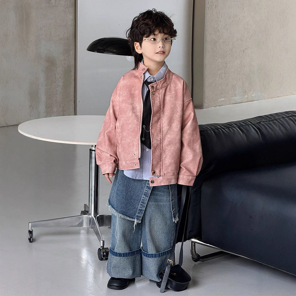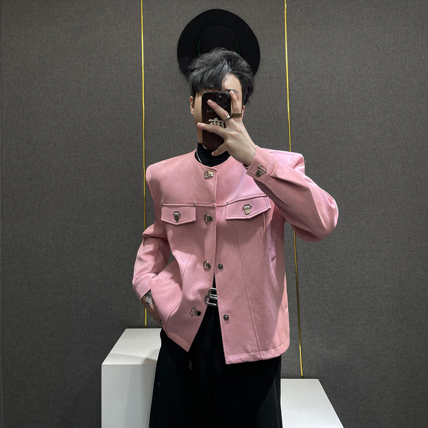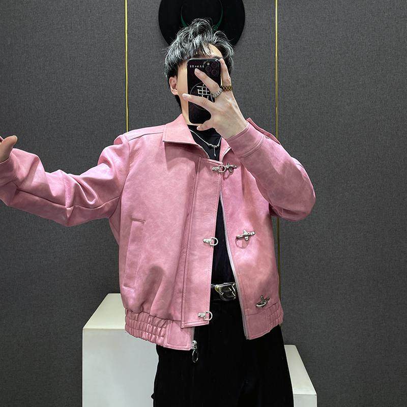 鹿鹿/小众设计感粉色短款皮衣夹克男金属扣痞帅潮流外套高级感潮
