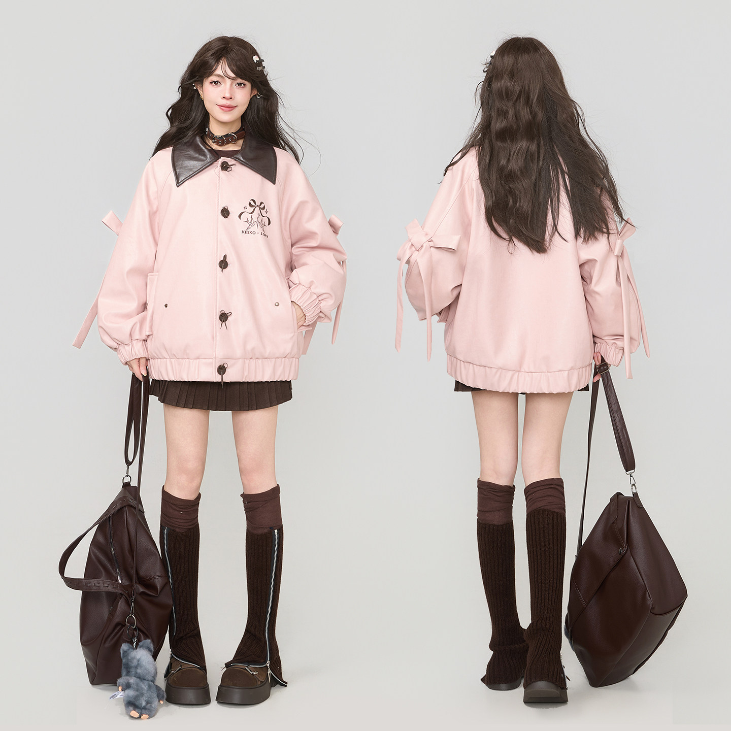 KEIKO [夹棉] 酷飒粉色蝴蝶结皮衣棉服女25冬季撞色翻领夹克外套