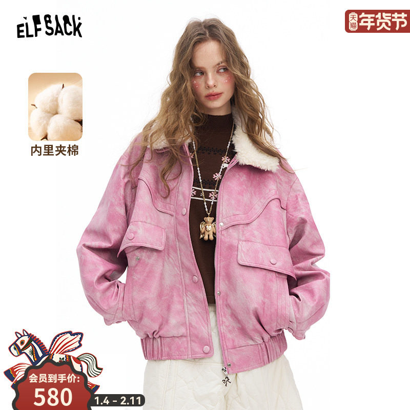 妖精的口袋粉色晕染PU夹棉皮衣女2025年冬季新款可脱卸羊羔毛毛领