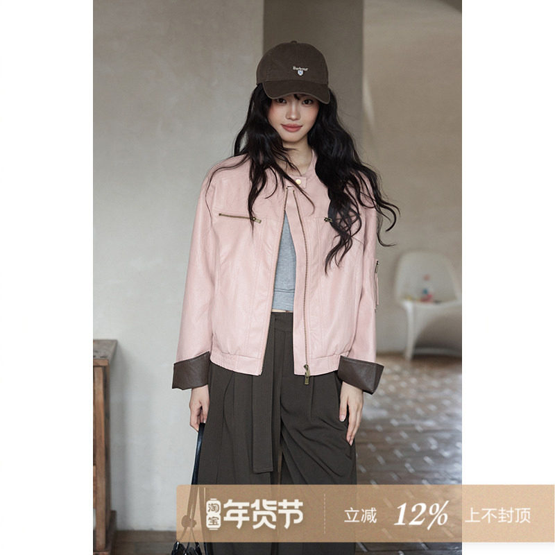 欧港妮粉色复古皮衣女短款2025春秋季新款高级感小个子拼接夹克潮
