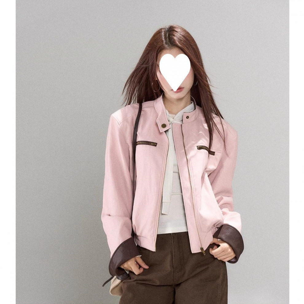 3MER哦哦三妹粉色皮衣女2025秋冬新款韩系复古撞色设计感宽松外套