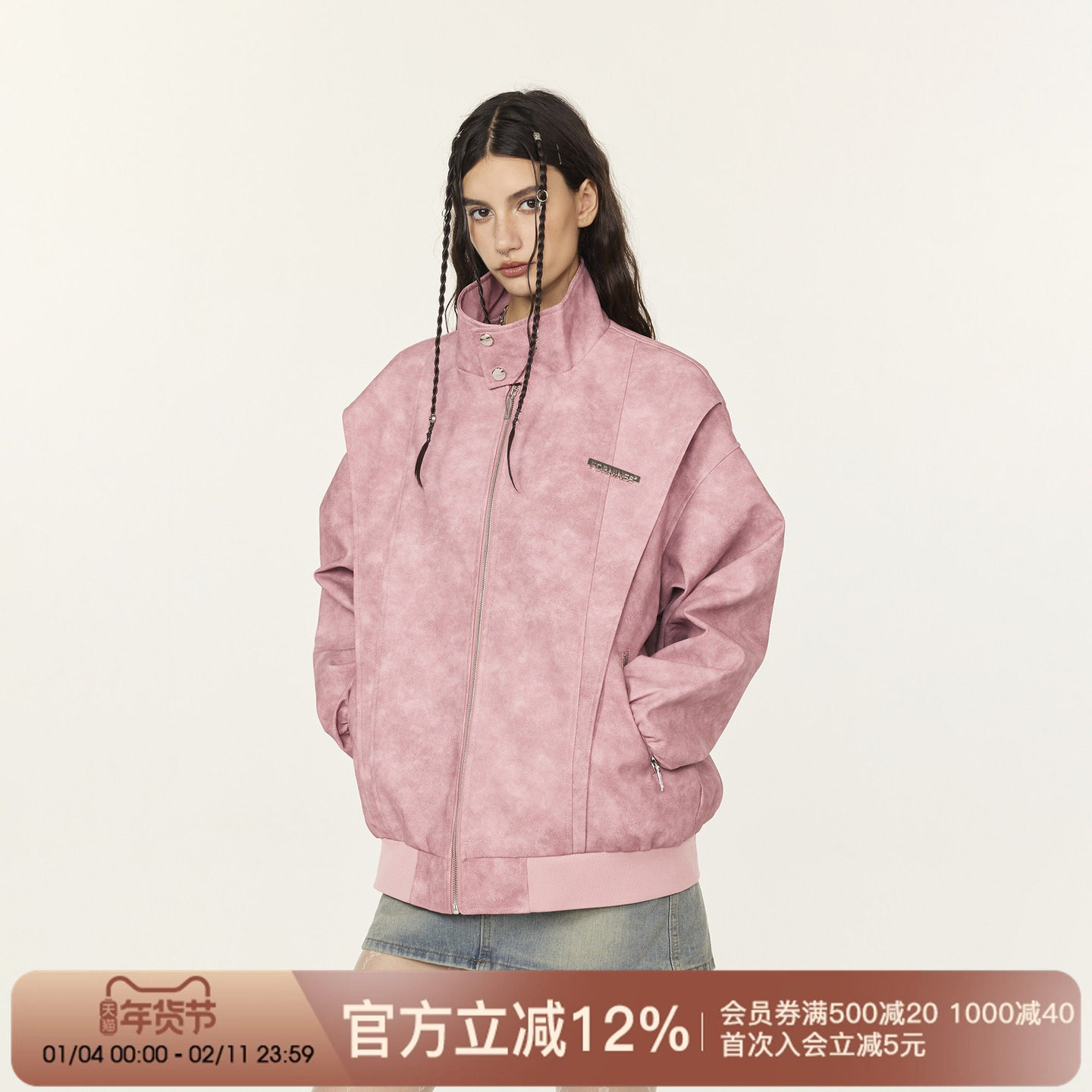 悟空有货美式金属装饰粉色翻领皮衣夹克男女潮牌宽松百搭情侣外套